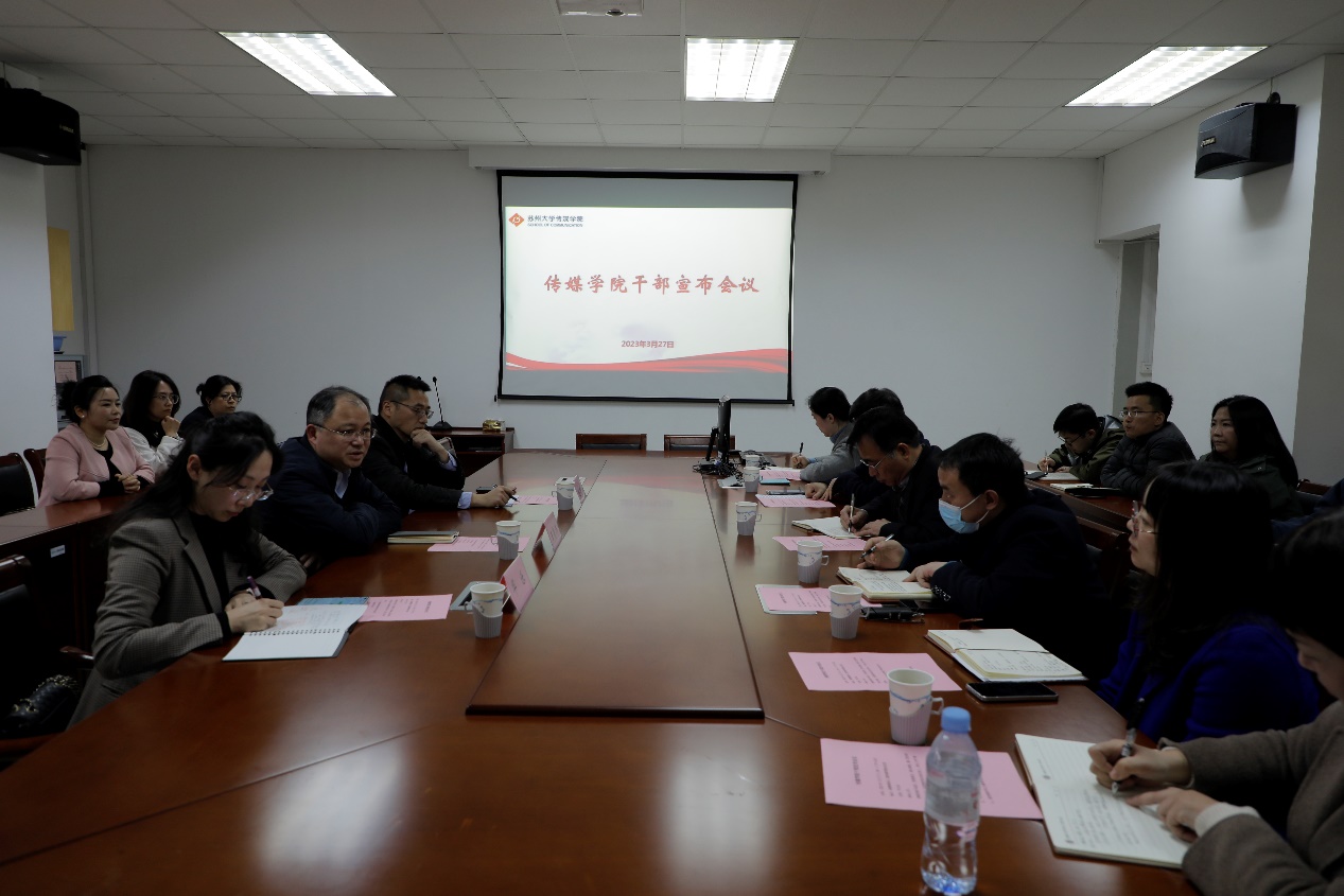3月27日,传媒学院在学院5243学术活动中心召开干部宣布会议,宣布学校党委关于学院干部任免决定。党委组织部副部长程晓军、党委办公室文秘科科长华乐出席会议。会议由传媒学院党委书记宁正法主持。校党委副书记王鲁沛出席会议并讲话。