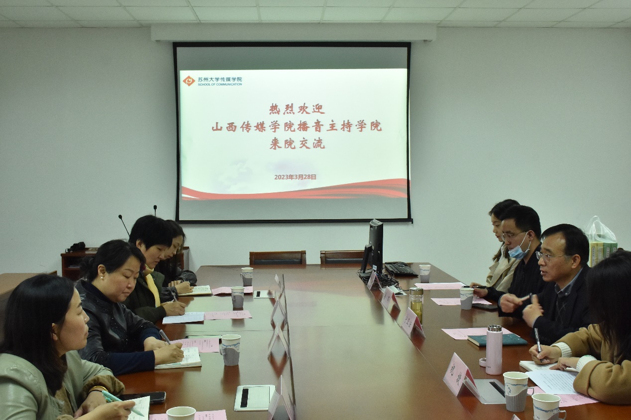 3月28日上午,冠军体育下载与山西传媒学院播音主持学院交流会在5243会议室举行。会议就专业建设、人才培养等内容进行交流座谈。山西传媒学院播音主持学院副院长、教授肖俏,播音教研室主任、教授彭晓燕,副教授李书贤,赵娜老师,冠军体育下载党委书记宁正法,广播电视系副主任、副教授祝捷,岳军老师,以及学生代表参加本次交流会,会议由祝捷主持。
