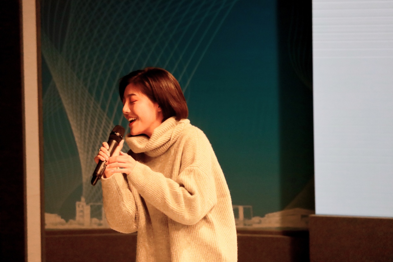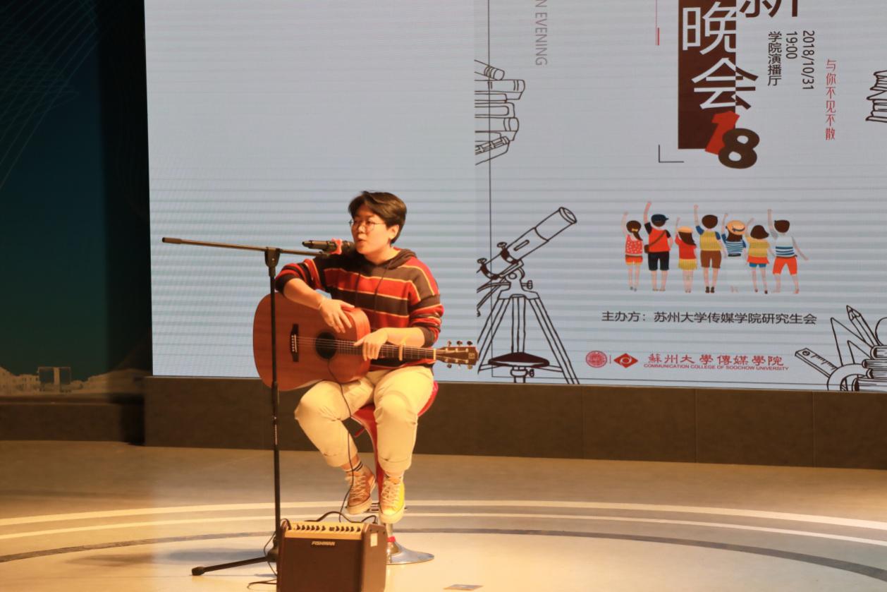 首先,有着“苏大吴彦祖”之誉的倪瑞言同学走上舞台,为大家带来了一首自己的原创歌曲,用她温暖的嗓音、动人的旋律献上了自己对新同学真挚的欢迎。