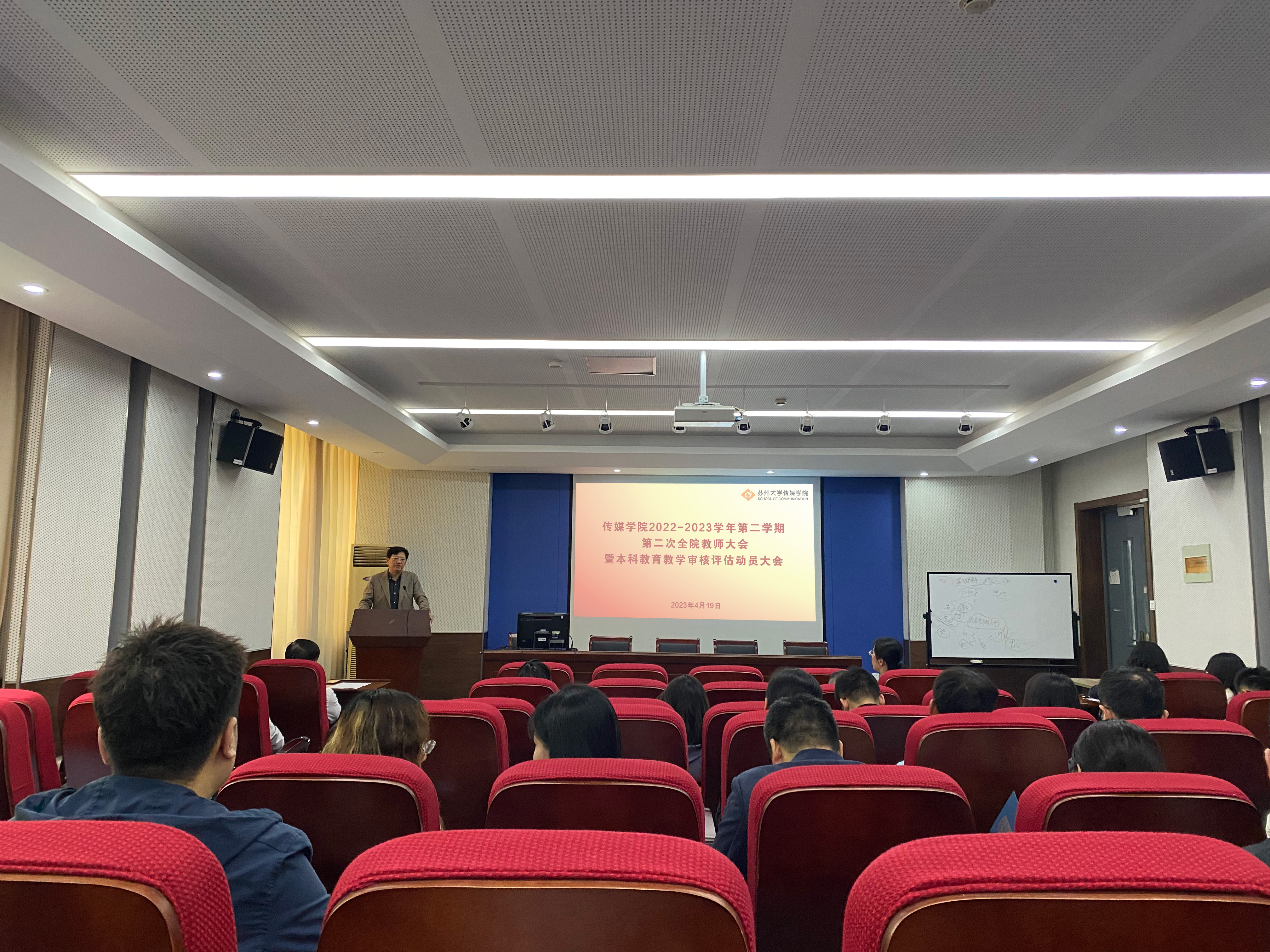 4月19日下午,传媒学院2022-2023学年第二学期第二次全院教师大会暨本科教育教学审核评估动员大会在学院5148会议室召开。学院全体教师出席本次会议。会议由学院党委书记宁正法主持。