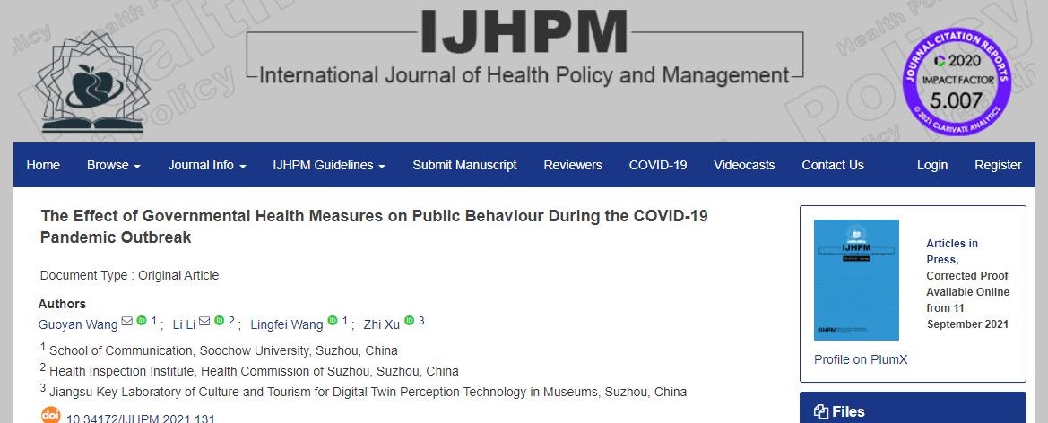 近日,冠军体育下载王国燕教授领衔的科技传播跨学科团队与苏州市卫生监督所合作,采用一种“混合大数据可视化”的创新方法,精准地揭示出公共危机爆发期公众行为所呈现的三阶段规律及其与当地政策之间的密切关系。研究以“The Effect of Governmental Health Measures on Public Behaviour during the COVID-19 Pandemic Outbreak”为题发表于SSCI一区期刊International Journal of Health Policy and Management(IJHPM)。这是苏州大学乃至江苏省的研究人员发表于该刊的首篇研究型论文。