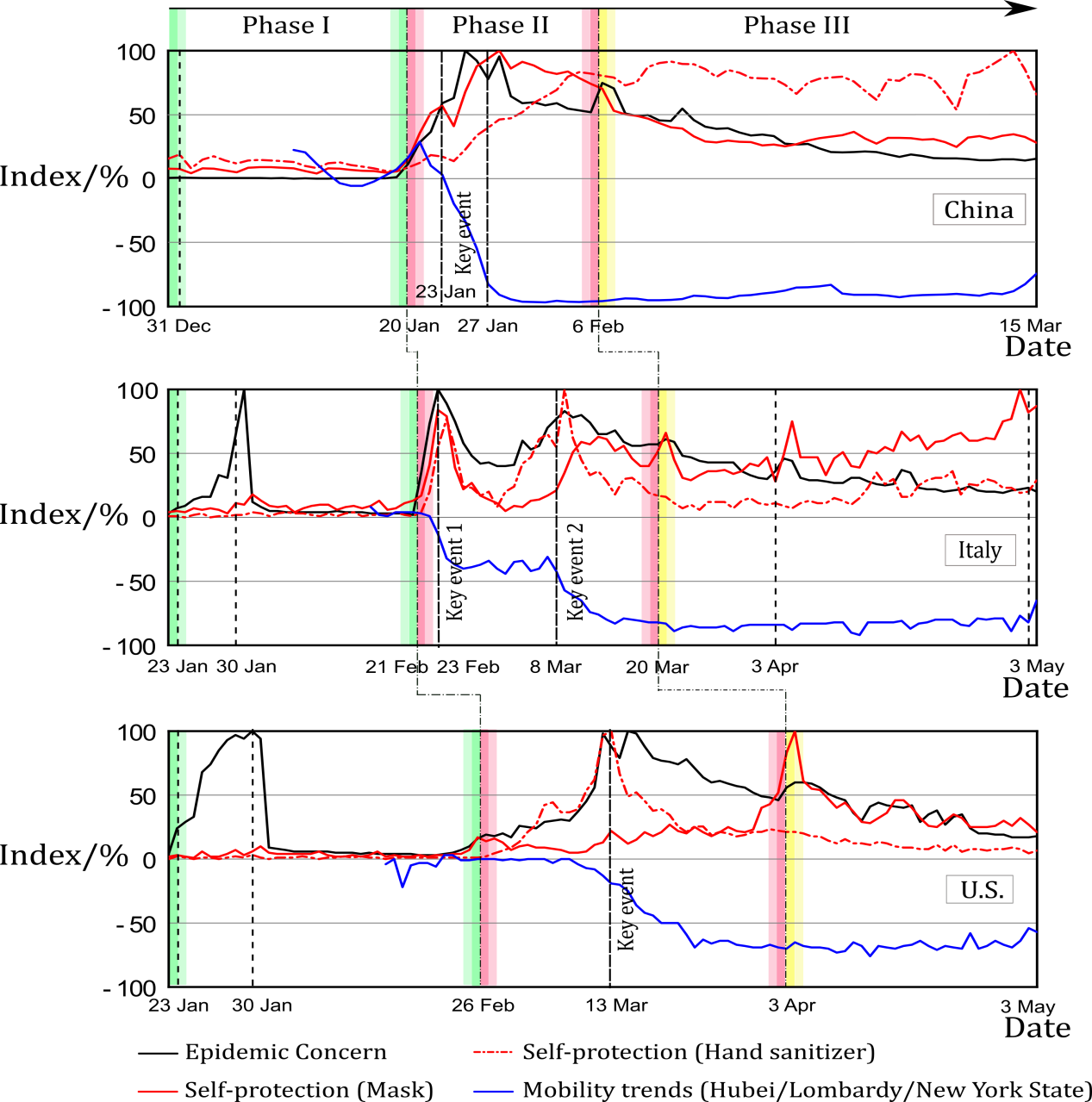 研究选取新冠爆发期亚洲、欧洲和北美洲疫情最为严重的代表性国家作为考察对象,分析了中国、美国、意大利这三个国家的疾控措施对公众行为的影响。首先抓取了来自谷歌、百度、阿里、苹果等多个权威开源平台的大数据来构建公众行为指数,以各国民众对新冠的搜索行为作为疫情关注指数、对消毒液和口罩的购物搜索行为作为自我防护指数、以人口流动迁徙行为作为人口流动指数,并通过数据的相对变化结果实现了各个平台不同标准数据的有效统一。然后通过政府官网和权威公共卫生机构网站发布的健康指南、疫情通报和疫情管理措施等信息建立起三个国家新冠疫情防控措施的数据全集,从而绘制出混合大规模数据可视化信息图来直观地反映政策措施对公众行为的影响。