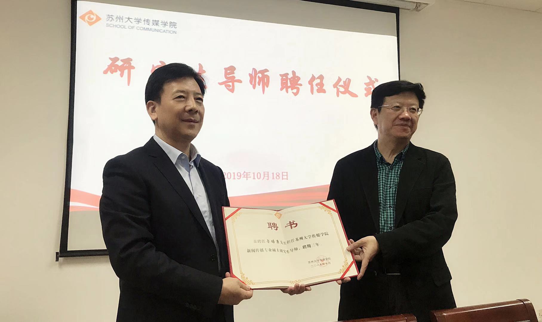 2019年10月18日下午,《中国广告》杂志社社长/主编鲁培康先生莅临传媒学院讲学,与广告专业师生就“数字时代的广告专业教育”召开交流与研讨。《中国广告》杂志社副社长/副经理沈婷女士、广告专业马中红教授、王静副教授、程粟老师、刘均星老师、张可老师和部分研究生、本科生代表出席了研讨会。研讨会由广告系主任胡明宇副教授主持。学院执行院长陈龙教授代表学院致辞,并向鲁培康先生颁发了兼职研究生导师聘任证书。