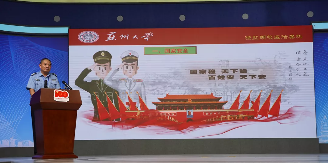 会议还邀请到了苏州大学保卫部(处)独墅湖校区治安科科长芈志坚老师给大家做安全教育讲座。他通过详实的案例,生动的讲解并提醒每位同学时刻注意人身安全、财产安全。