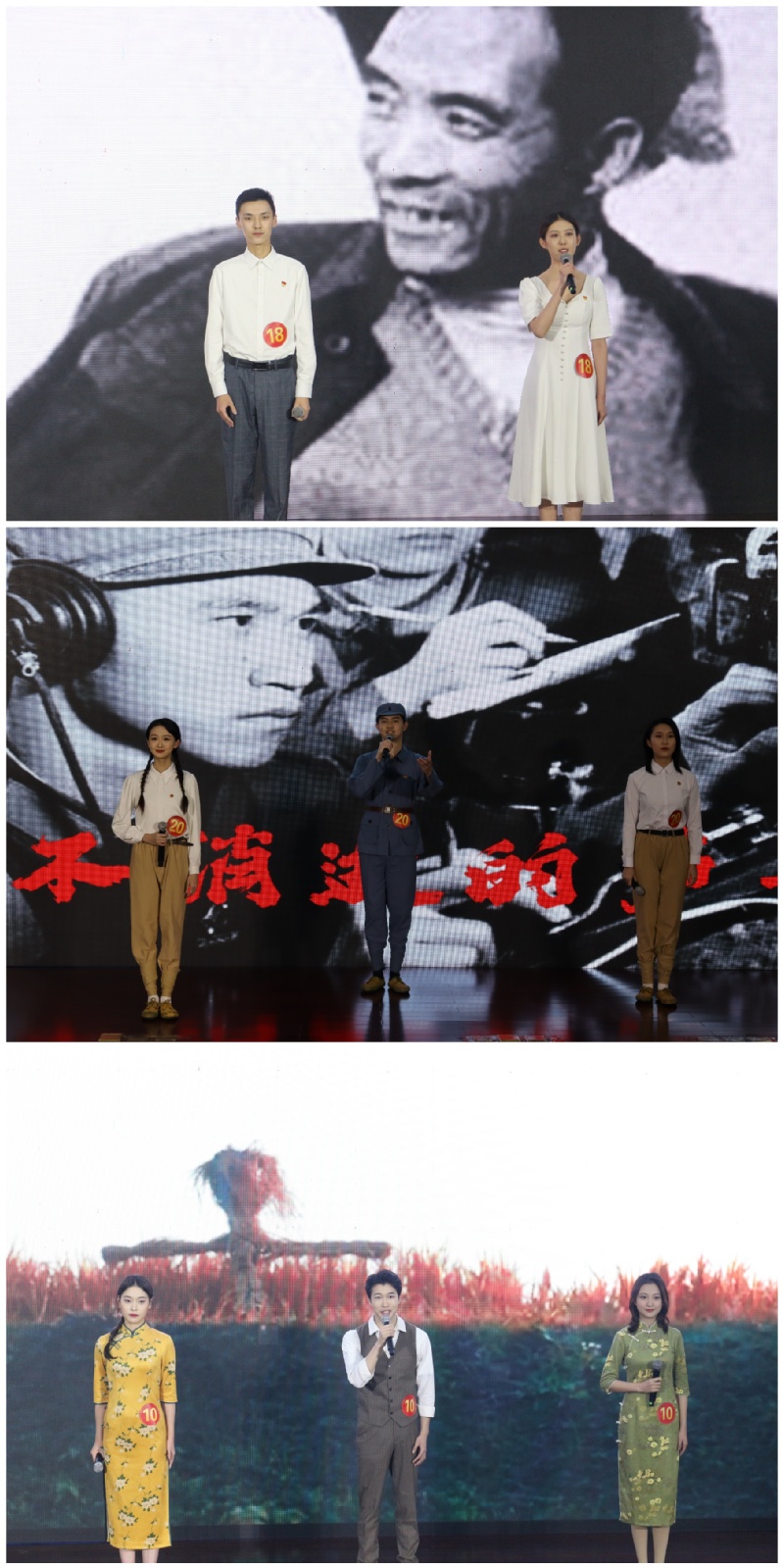 2018级刘淳、安辰同学带来原创作品《闪亮的篇章》,以焦裕禄同志的事迹为切入点,歌颂了波澜壮阔的脱贫攻坚事业;2019级吴若晗、付宸溪、王志峰三位同学演绎了作品《永不消逝的声音》,致敬所有为广播电视事业奋斗的人们;2019级于汶灵、张子豪和2020级李宜霖同学朗诵作品《春》,在诗情画意中描绘蓬勃春天里昂扬向上的精神。三支队伍同学的精彩朗诵引发现场的强烈共鸣,赢得了观众的阵阵掌声。