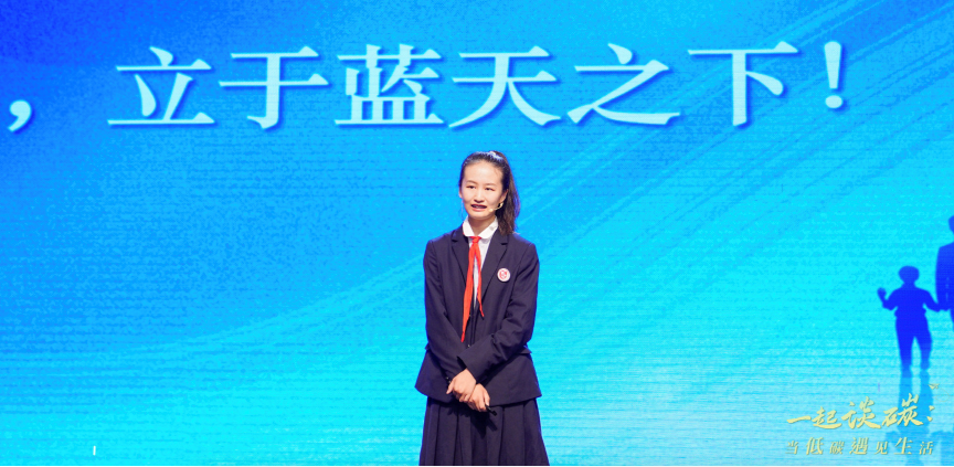 苏州中学园区校初二(1)班祝千寻上台,作为“小小赛先生”演讲了《蓝天之下,你我携手》。