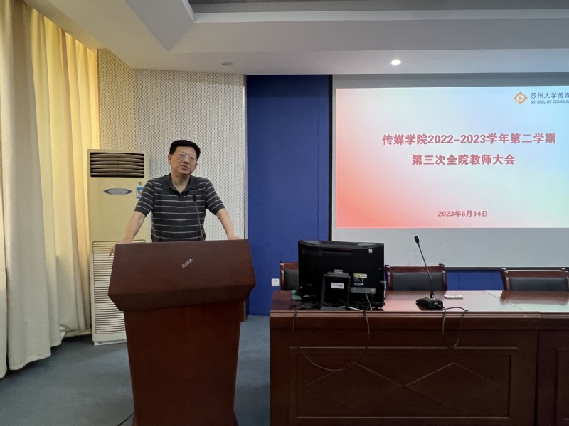 6月14日下午,传媒学院2022-2023学年第二学期第三次全院教师大会暨双周三政治学习在学院5148会议室召开。学院全体教师出席本次会议。会议由学院党委书记宁正法主持。
