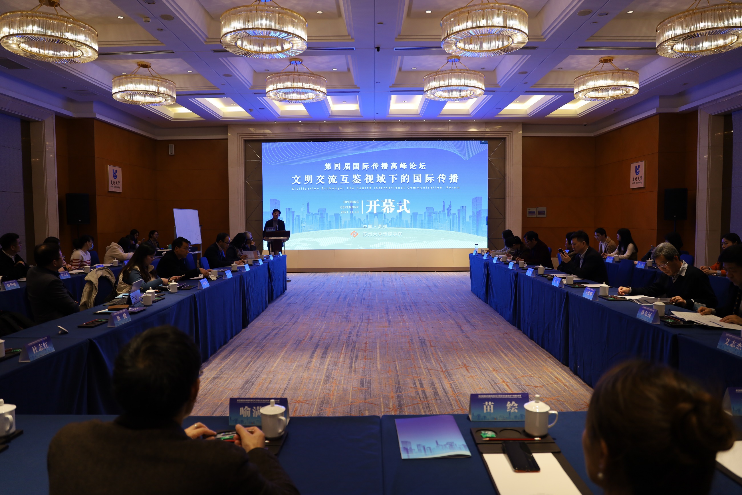 11月13日,由传媒学院主办的第四届国际传播高峰论坛在苏召开,来自各大高校的60余名专家学者以线上线下相结合的方式参会。本次论坛以“文明交流互鉴视域下的国际传播”为主题,设有1个主题论坛,5个分论坛。参会学者就文明交流互鉴、人类文明新形态、“一带一路”深化方案、中国文化走出去等议题,展开了热烈的讨论。传媒学院党委书记宁正法主持开幕式。