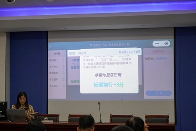比赛以分队抢答开始,现场将参赛选手分为“不忘初心”“牢记使命”“砥砺前行”“披荆斩棘”“急流勇进”五支队伍,依托微信线上小程序的形式,各队成员齐心协力、共同答题,答对得分,答错或不答扣分。在经过了“小试牛刀”“并驱争先”“乘风破浪”三轮激烈的答题角逐后,“砥砺前行”队、“急流勇进”队和“不忘初心”队脱颖而出,步入“决战之巅”,争夺本次知识竞赛的冠亚季军。