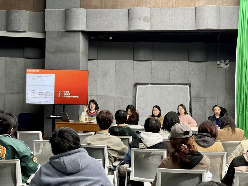 会上,教务老师亓雪首先对2024级新计划的调整情况、课程考试性质、过程性和纯实践课程考核形式、各科考试时间和安排等作出了详细的讲解,并提醒2023级同学有序安排学习计划,认真对待2025年1月份的最后一次正考,做好毕业论文写作和毕业准备。负责学生工作的魏巍老师将开学以来学生工作中遇到的问题逐一强调,包括学生考试作弊、日常出勤请假管理、宿舍问题、安全问题、学风班风、奖罚机制等多个方面,提醒学生遵守学校学院的规章制度,严于律己,端正学习态度。