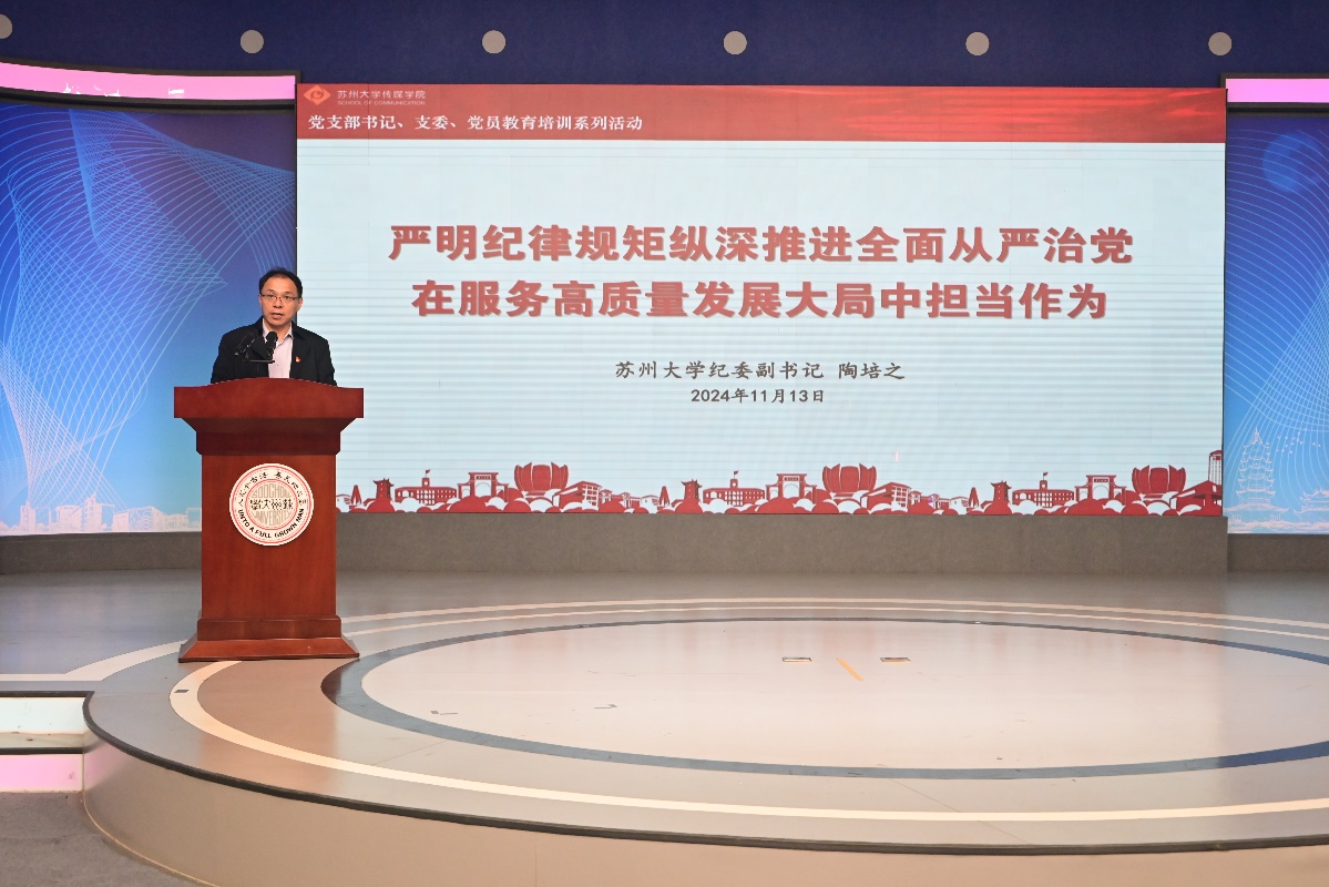 为了深入贯彻落实党的二十大精神,积极响应党中央全面从严治党的号召,进一步强化学院党风廉政建设,严明纪律规矩,并着力提升基层党组织书记及支委的政治站位与工作能力,传媒学院党委于11月13日下午在独墅湖校区1005幢大演播厅举办了以“严明纪律规矩,全面从严治党”为主题的支部书记、支委、党员教育培训。此次培训由校纪委副书记陶培之担任主讲嘉宾,学院全体党委委员、支部书记及师生党员参加了本次培训会议,党委书记张健主持会议。