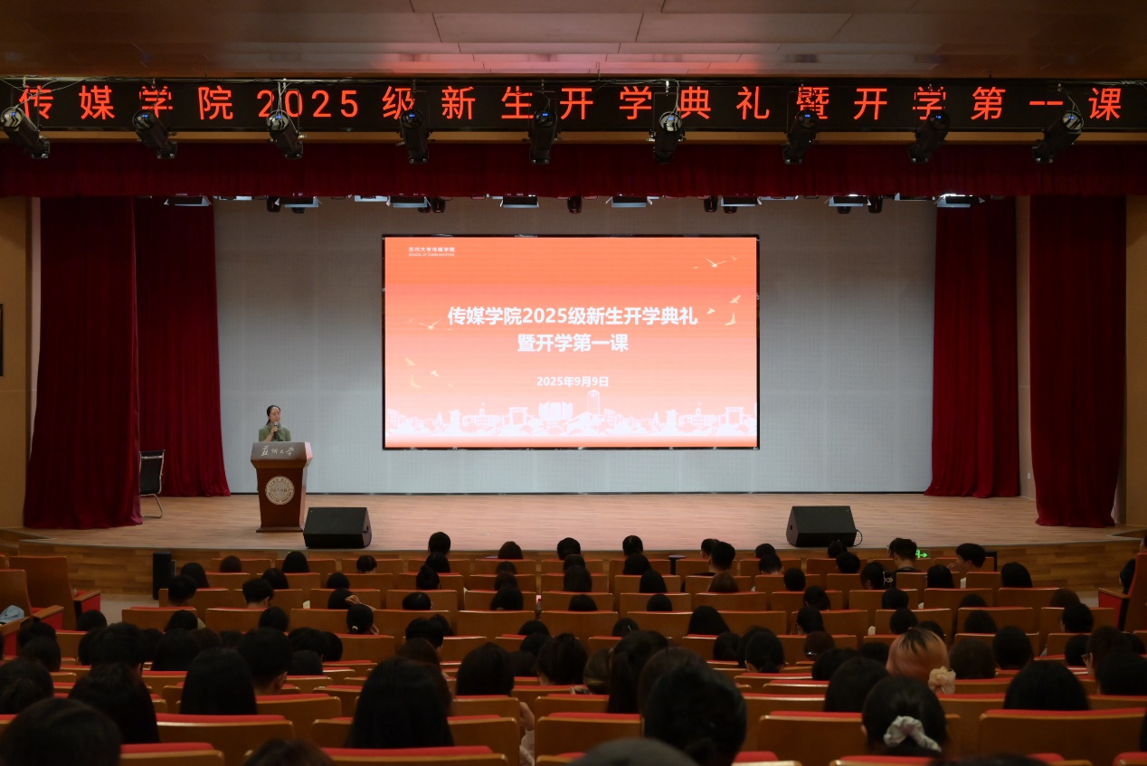 9月9日下午,传媒学院2025级新生开学典礼暨开学第一课在独墅湖校区文体中心多功能厅举行。传媒学院院长、苏州广电传媒集团(总台)党委书记、台长、董事长沈玲,执行院长陈龙,党委书记张健,党委副书记、副院长丁姗,副院长张梦晗,副院长黄艳凤,导师与教师代表,2025级本科生成长陪伴计划导师及导生,2025级本科生班主任和班主任助理,2025级全体本科生、研究生共同参与本次活动。活动由丁姗主持。