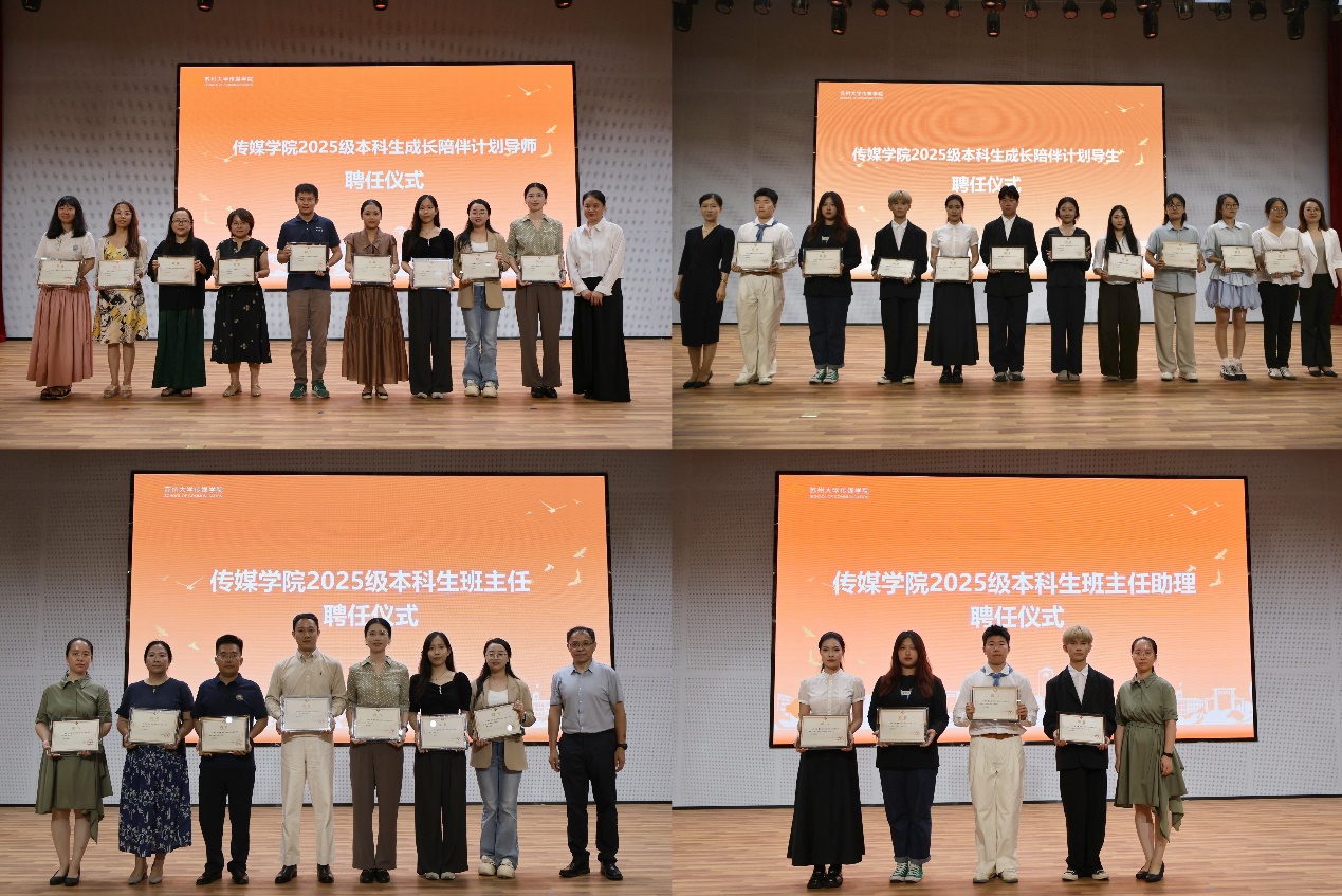 随后举行授聘仪式。由沈玲为学院9位2025级本科生成长陪伴计划导师颁发聘书,张梦晗、黄艳凤为2025级本科生成长陪伴计划导生颁发聘书;张健、丁姗分别为2025级本科生班主任及班主任助理颁发聘书。聘书传递的不仅是荣誉,更是学院对新生成长的用心护航。