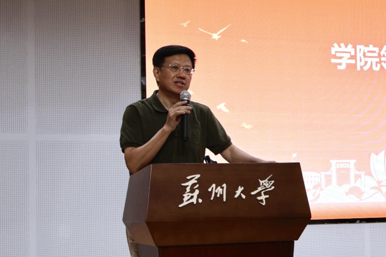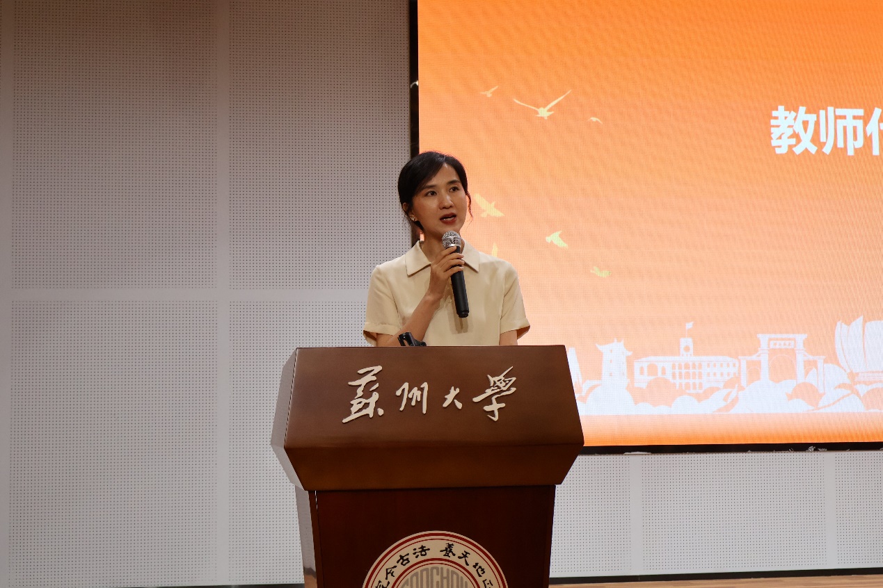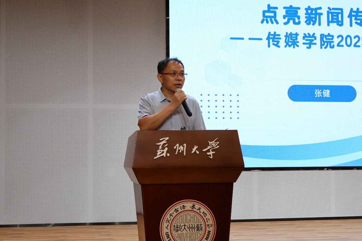全燕代表全体教师发言,热忱欢迎25级新生们的到来。她说,高质量的学习往往发生在被问题“击中”的瞬间,面对信息洪流与人工智能带来的挑战,传媒学子的核心价值在于通过信息筛选、叙事组织和社会观察,从而建构社会认知体系。她希望同学们在苏州这座城市中学会观察,在苏大的厚重与开放之间学会思考,在传媒学院的创新与磨砺中学会担当,在复杂世界中保持清醒与力量。