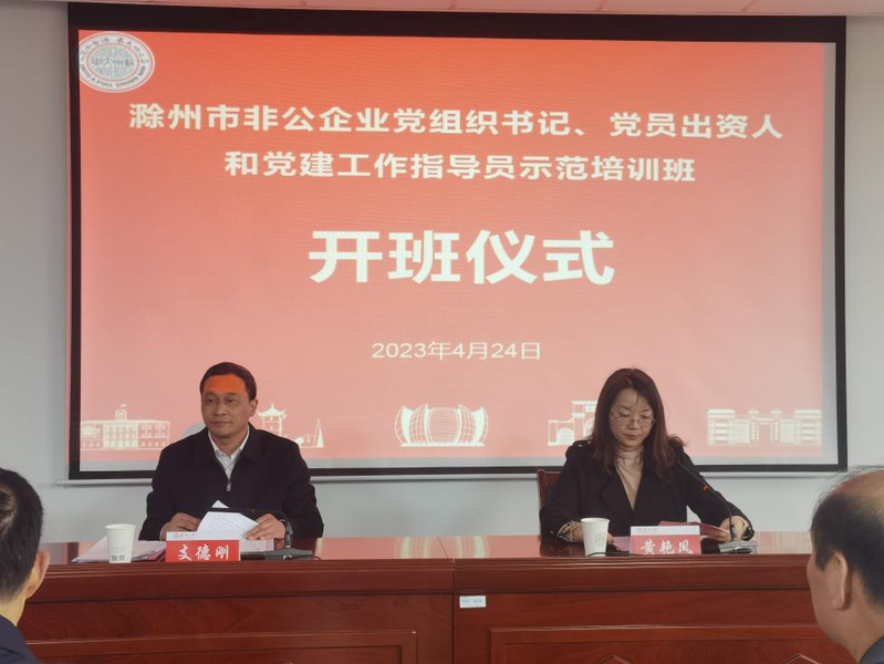 2023年4月24日下午,滁州市非公企业党组织书记、党员出资人和党建工作指导员示范培训班开班仪式在我校培训中心205教室举行。来自滁州市非公企业党组织书记、企业出资人以及党建工作指导员约150名学员参加了本次开班。滁州市委组织部副部长、市委非公工委书记支德刚同志、苏州大学管理培训学院副院长黄艳凤同志、滁州市委非公工委办公室主任、四级调研员李广忠同志出席了此次开班典礼。