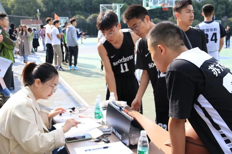 2020年10月25日,校研究生篮球赛决赛在独墅湖二期篮球场拉开帷幕。上午八点十分,志愿者们提前到达了比赛场地,开始整理比赛用具、准备签到事宜。为了更好地为选手们服务,做好记录、协调和保障工作,他们准备得非常充分,在比赛开始前逐一确认和清点矿泉水、扩音器、签到名单、计分表和药箱等比赛相关用品。