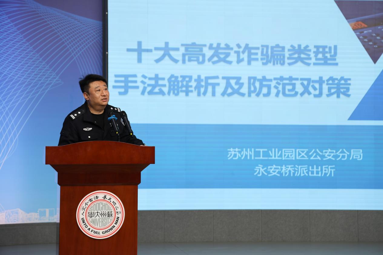 苏州工业园区公安分局永安桥派出所副所长张彦作《青春无悔,反诈有招》专题讲座。张所长结合自身在公安工作中的实战经验,详细剖析了校园中常见的诈骗典型案例,直观展示了诈骗分子的犯罪过程和受害人的受骗经历,警醒师生提高警惕。他重点分享了一系列实用有效的反诈策略和技巧,教导师生们在遇到诈骗时沉着冷静,从容应对。