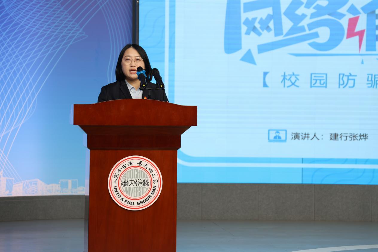 随后,建设银行胜浦支行副行长张烨作《金融反诈进校园,铸牢防线保财产》专题讲座。张行长深入剖析了金融领域常见的诈骗手段,从网络贷款诈骗到信用卡诈骗,她将专业知识与身边实际案例相结合,以深入浅出的方式指导在场师生如何辨别和防范金融诈骗陷阱,确保个人财产安全。