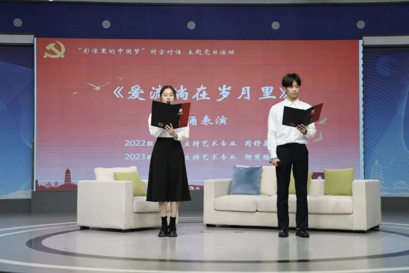 活动伊始,2023 级播音与主持艺术专业的柳楚晗和 2022 级播音与主持艺术专业的芮舒晨带来诗朗诵《爱流淌在岁月里》。他们以深情而庄重的语调将对钟枚前辈的崇高敬意融入每一个词句之中,让在场观众深切感受到钟老与其夫人王迪间流转的岁月与永恒的爱,为本次党日活动奠定了一个庄严而又温馨的基调。