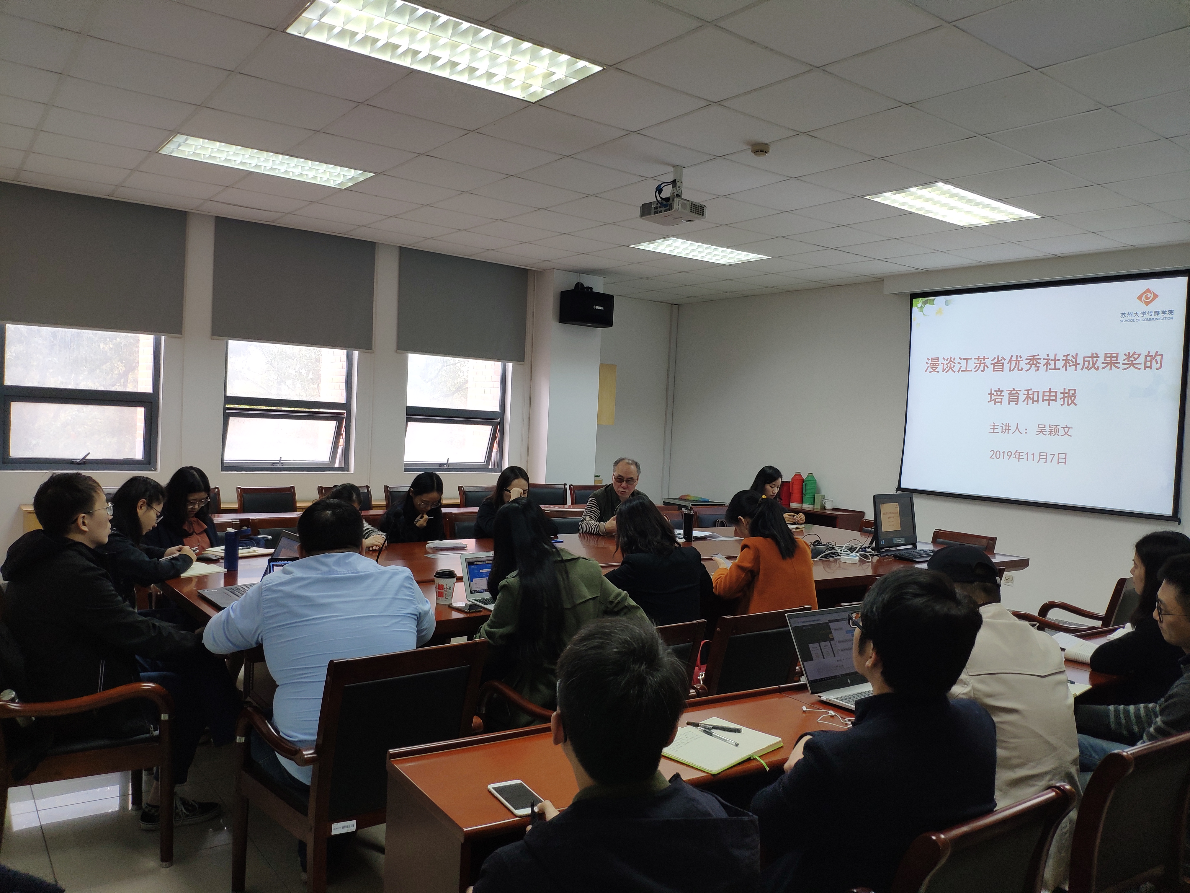 11月7日下午2点,江苏省社科联评奖办公室吴颖文主任受邀来我院就江苏省优秀社科成果奖的培育和申报问题,进行了指导与分享。此次座谈会由院长陈龙教授主持,我院二十余名青年教师参加了座谈会。