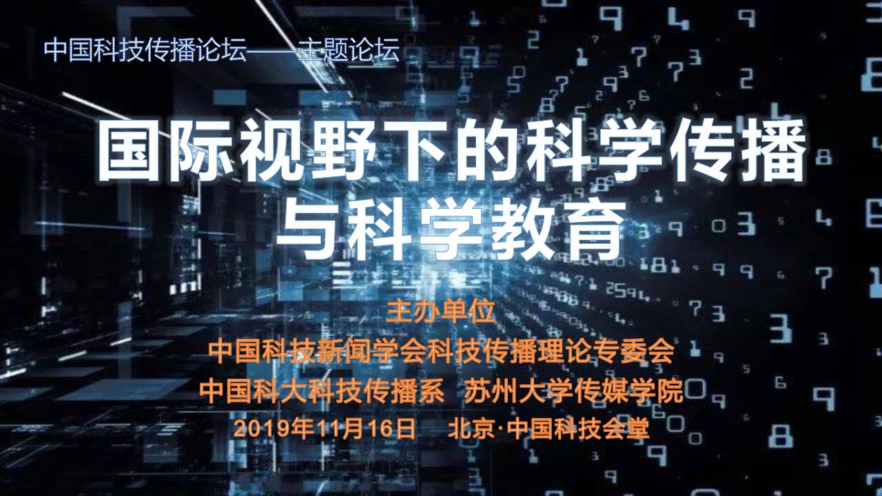 11月16日,科技传播领域一年一度的盛会——中国科技传播论坛在北京中国科技会堂隆重召开,论坛设置了七个主题分论坛,其中“国际视野下的科学传播与科学教育”主题论坛由中国科技新闻学会科技传播理论专委会(下称专委会)、中国科学技术大学科技传播与科技政策系、冠军体育下载三方共同主办,目前,中国科大科技传播系为该专委会的理事长单位,冠军体育下载是该专委会的秘书长单位。