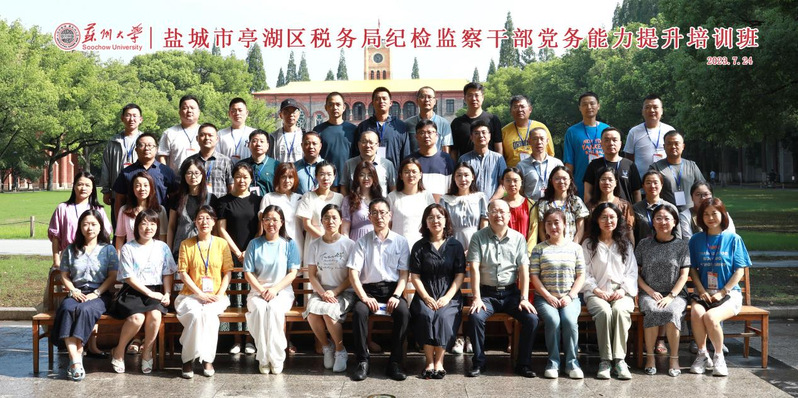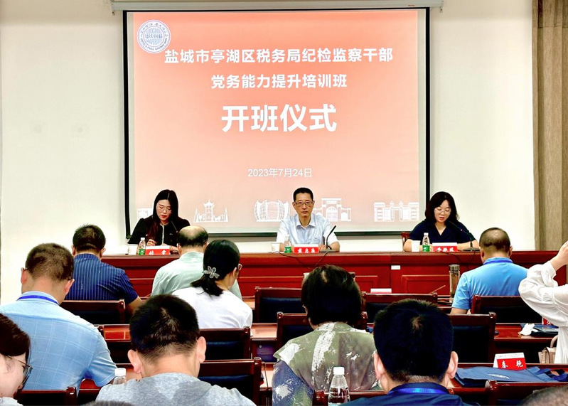 2023年7月24日上午,盐城市亭湖区税务局纪检监察干部党务能力提升培训班开班仪式在我校天赐庄校区培训中心102举行。来自盐城市亭湖区税务局各股室业务骨干约50名学员参加了本次开班。盐城市亭湖区税务局党委委员、副局长、机关党委书记戴启庚同志和苏州大学管理培训学院副院长黄艳凤同志出席了此次开班典礼。
