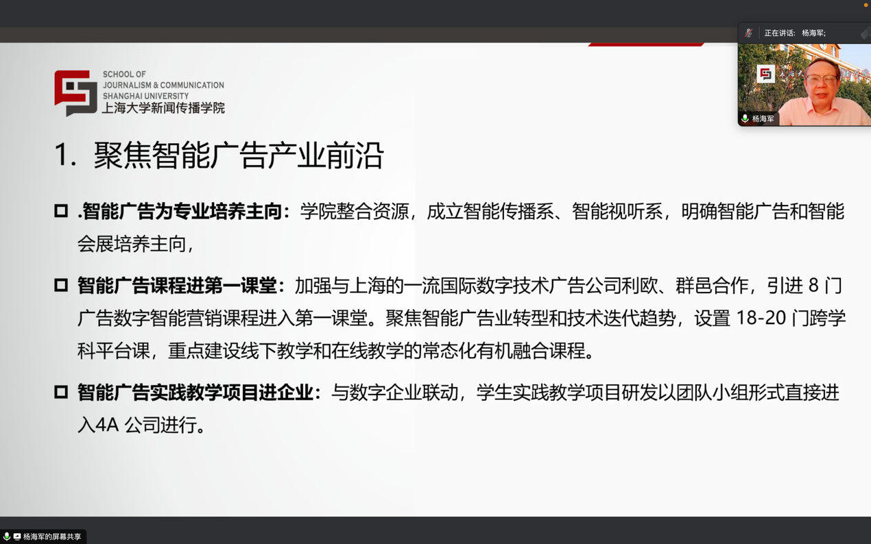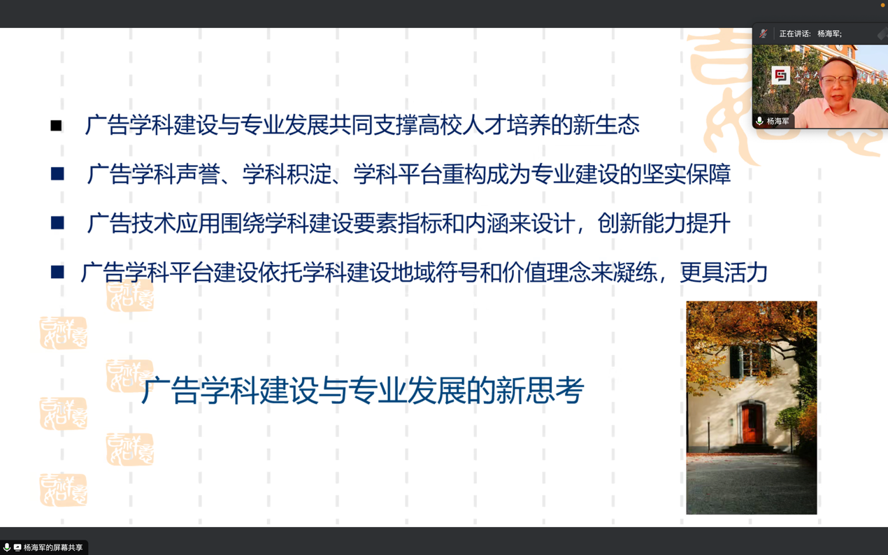 在正式分享环节,杨海军教授首先介绍广告学科平台建设和专业发展的目标。杨教授指出,学科建设与专业发展是建设高校人才培养新生态的两大基石,学科声誉、学科积淀、学科平台重构是专业建设的坚实保障。在广告技术应用方面,要围绕学科建设要素指标和内涵,不断提升创新能力。在学科平台建设方面,依托地域符号和价值理念则会更具活力。