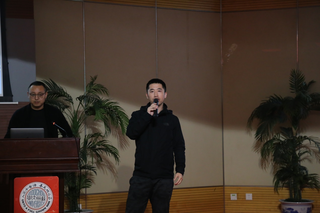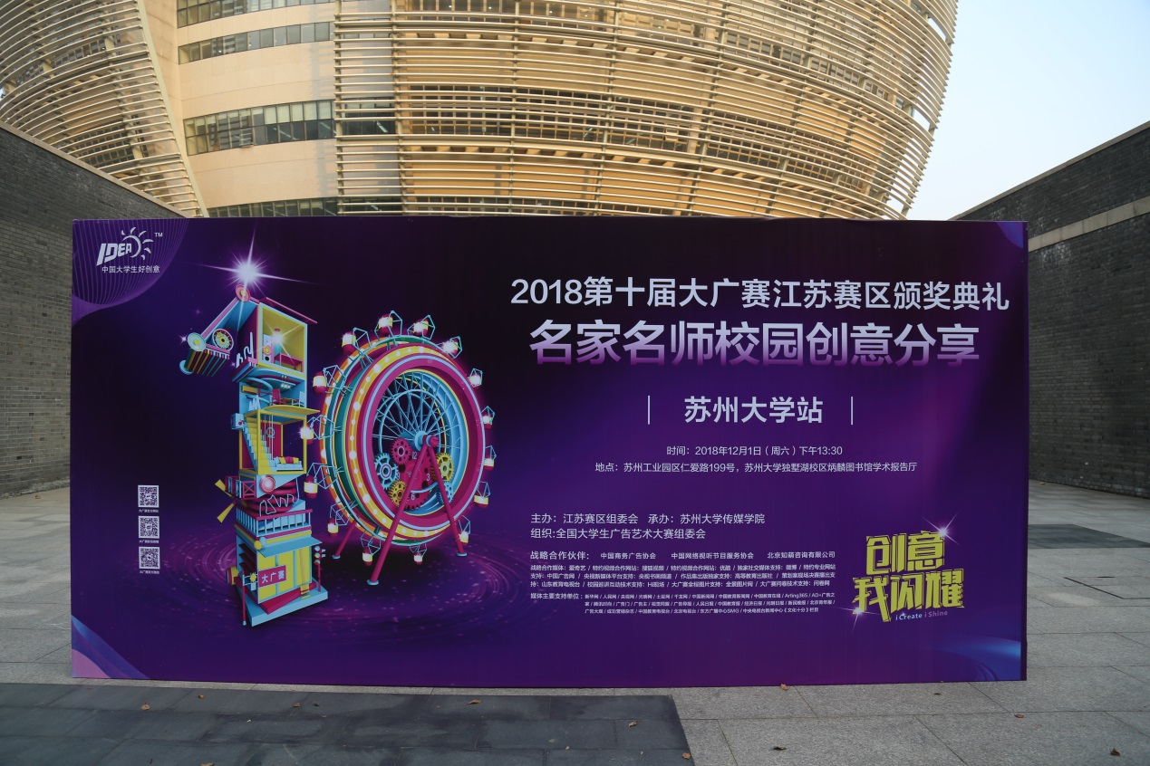 颁奖典礼的横幅海报静静地树立在学术报告厅的门外,海报的背后是独墅湖校区标志性的建筑炳麟图书馆。苏州的秋末,稠云之中渗出的一抹阳光给海报披上了几缕流苏,这一幕吸引了诸多苏州大学乃至兄弟高校赶来的领奖师生合影留念。“本来还担心找不到会场,很远就看到了醒目的海报和合影的人群,我也去合了影,就单纯觉得广告人也需要仪式感,需要把一些用汗水换来的美好画面定格。”来自16级广告学专业的张同学满面笑容,与同行的组员合照后便进入会场,根据席卡在“一等奖”席位中落座。