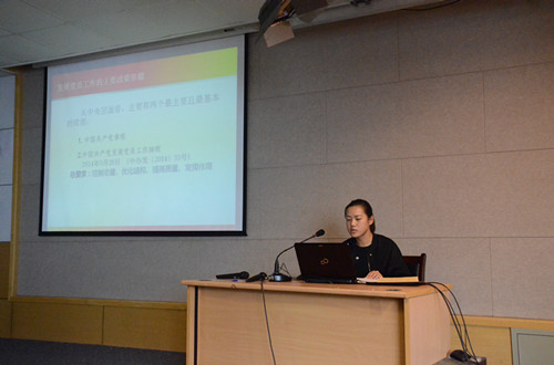 讲座由学院办公室主任黄艳凤老师主持,她介绍了本次党课培训讲座的目的及内容。黄老师着重强调了此次培训的主题:党员发展流程解读。她简单阐明,我们大学生党员要加强党的基本理论学习,首先就要明确入党的流程。黄老师认为,既然要入党,在进行爱党爱国教育、明确入党缘由、端正入党态度前,应当明确入党条件与入党步骤。