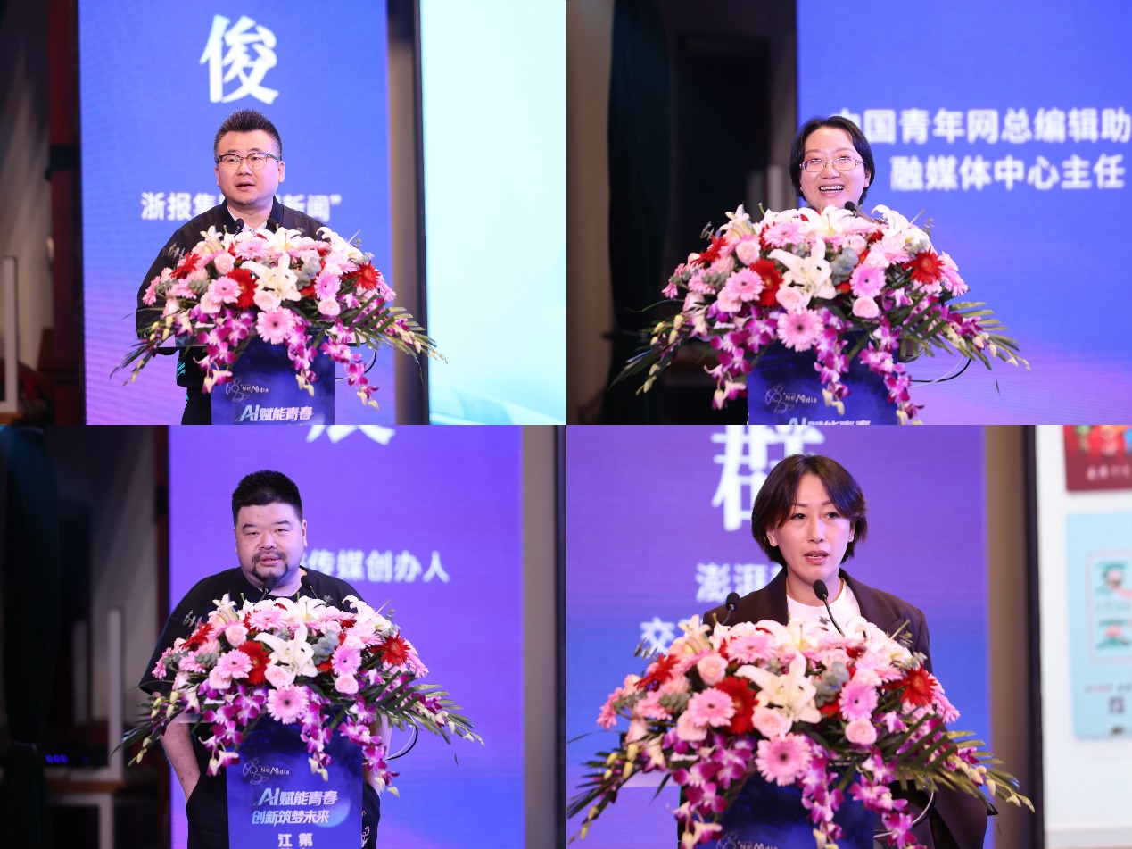 随后,智媒传播与新媒体发展论坛举行。浙报集团“潮新闻”常务副总编童俊,中国青年网总编辑助理、融媒体中心主任杨月,熊猫传媒创始人申晨,澎湃新闻交互设计部总监赵冠群4位业界嘉宾从主流媒体转型实践经验、融媒时代深入理解青年文化、AI与新媒体带来的新机会、媒体可视化产品的表达创新等角度作了精彩分享。