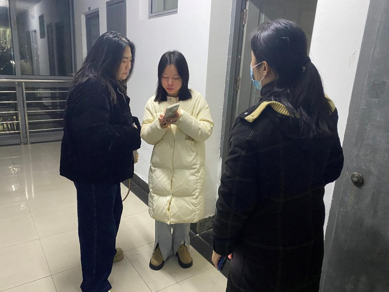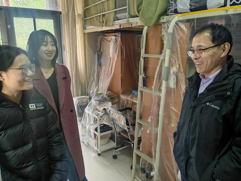 丁姗与辅导员一同走访了留校本科生宿舍询问了同学们留校期间的学习生活情况,并强调了注意宿舍用电安全、实习交通安全等问题,叮嘱同学们尽早返回家乡与亲人团聚欢度新春佳节。强调,辅导员要密切关注留校学生的思想动态与生活状况,多关心经济困难和学习困难学生,深入了解留校学生的学习计划和生活安排,为他们提供必要的帮助和关怀。