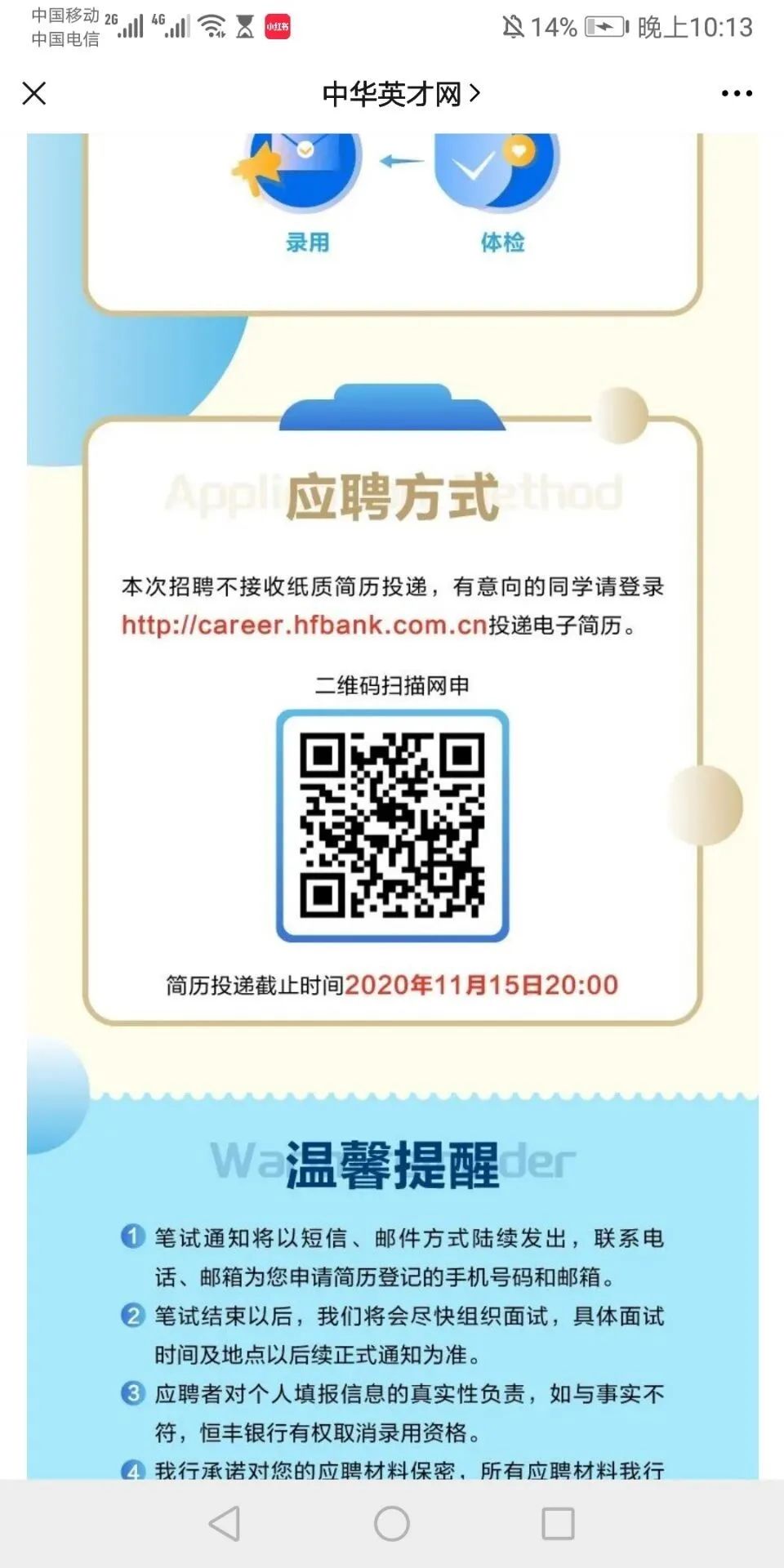 其中,应聘总行非科技类岗位的人员须通过国家大学英语六级或相应外语水平;主修外语专业的,应通过该语种相应的外语水平考试(如英语专业四级、八级等)。