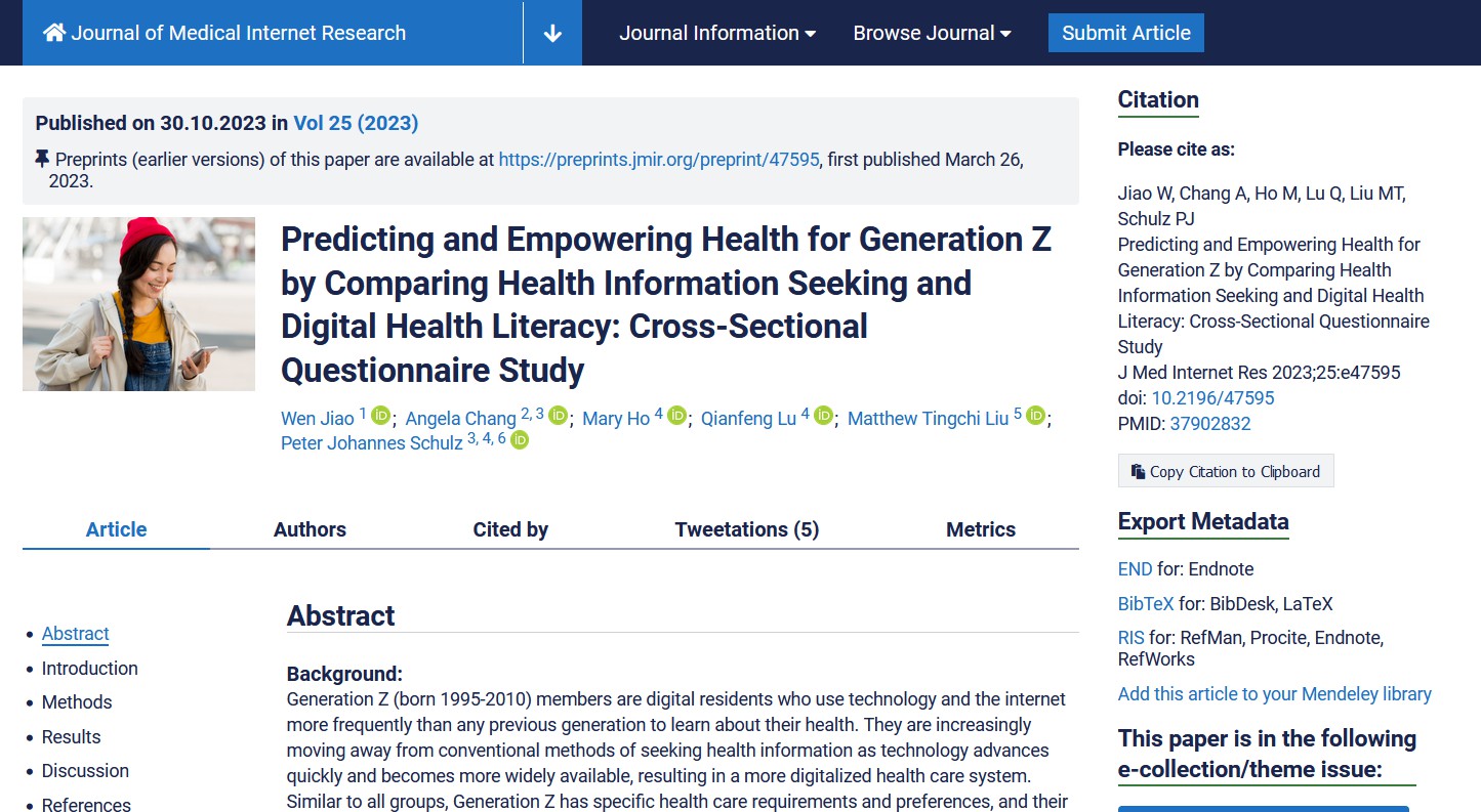 在此背景下,苏州大学科技传播研究中心主任王国燕教授领衔的科技传播跨学科团队联合澳门大学社会科学学院传播系张文瑜教授领衔的健康传播国际团队,通过对1862名中国受访者进行调查,比较了Z世代和老年群体的健康信息行为,开展了健康信息搜索与医疗保健的专题实证研究,研究成果以“Predicting and Empowering Health for Generation Z by Comparing Health Information Seeking and Digital Health Literacy: Cross-Sectional Questionnaire Study”为题, 2023年10月30日在线发表于医学信息学、健康保健科学与服务领域的SCI,JCR分区Q1期刊Journal of Medical Internet Research。