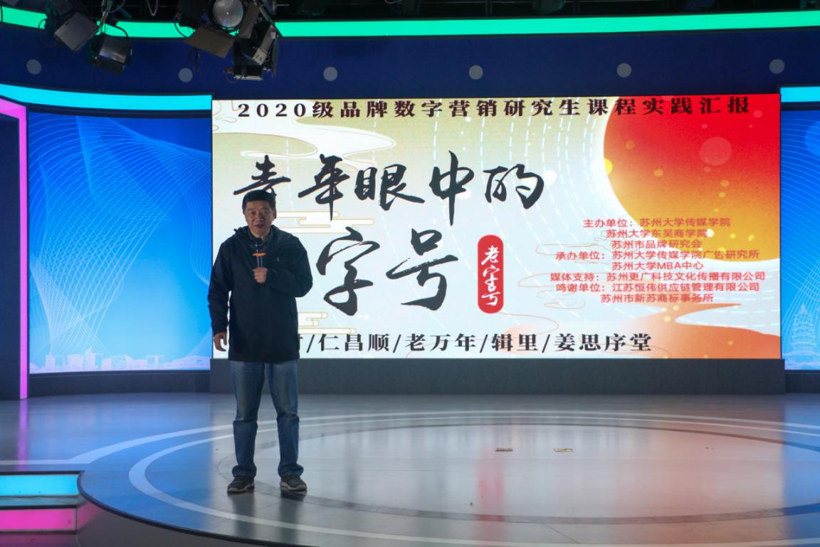 苏州市商务局流通业务发展处处长刘代江;国家市场监管总局《市场监督管理》编辑部主任助理、百度公共政策研究学术顾问洪海;《更苏州》主编、苏州更广科技文化传播有限公司副总经理温玺;苏州市品牌研究会副会长、苏州新苏商标事务所所长戴勤;冠军体育下载党委书记宁正法、副院长谷鹏;老万年金银有限公司董事长戚春兰;仁昌顺食品有限公司总经理陆小星、副总经理沈莉;姜思序堂国画颜料有限公司副总经理张磊;辑里丝绸有限公司总经理朱文超;苏州稻香村食品有限公司技艺传承中心市场部总监黄琼。课程老师苏州大学商学院教授魏文斌、商学院MBA中心副主任胡勇、传媒学院教授&广告研究所所长马中红;传媒学院副教授王静、课程助教胡良益以及2020级传媒学院选课研究生、2019级商学院MBA学员共120多位师生参与活动。