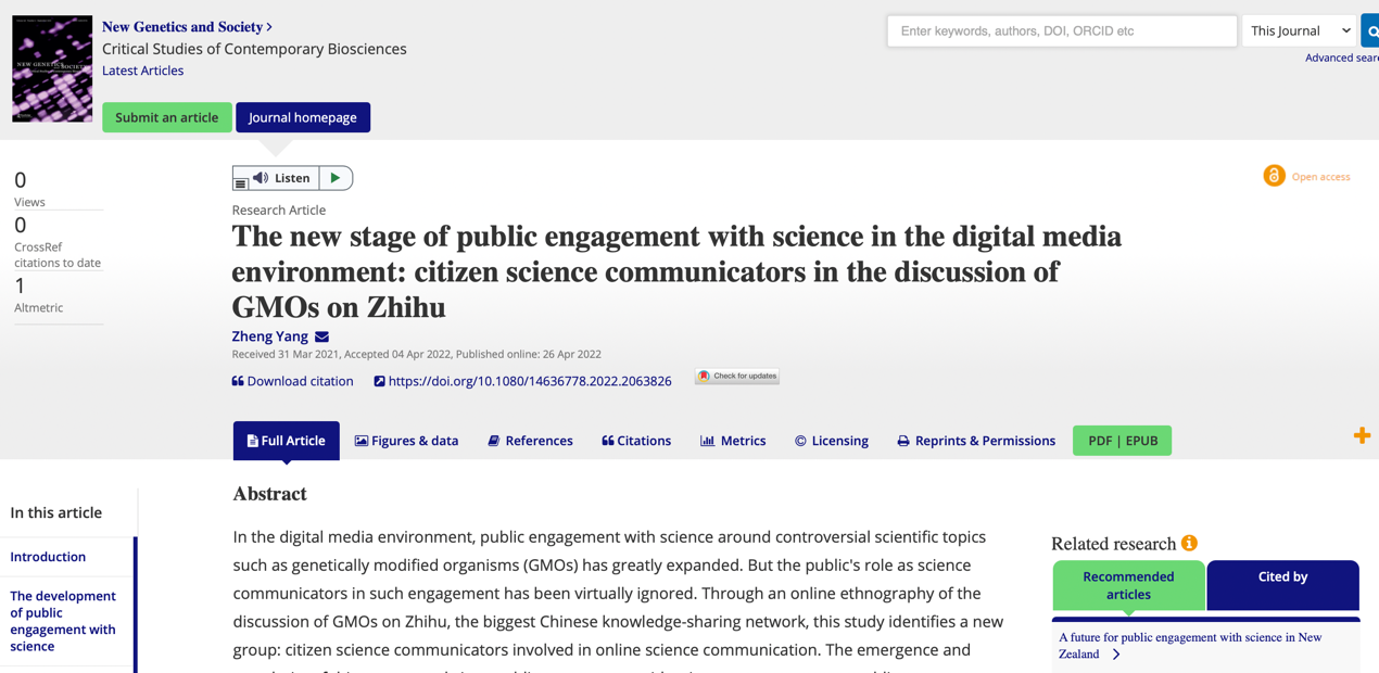 文章信息:Zheng Yang (2022): The new stage of public engagement with science in the digital media environment: citizen science communicators in the discussion of GMOs on Zhihu, New Genetics and Society, DOI: 10.1080/14636778.2022.2063826