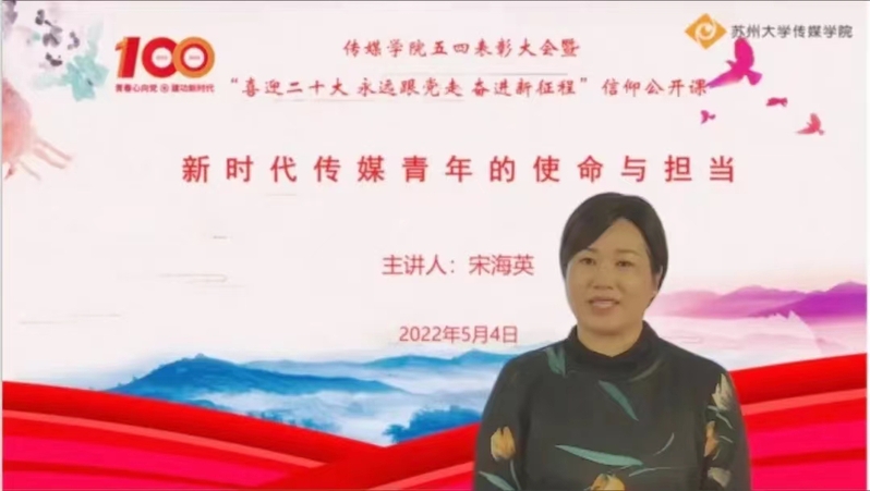 党委副书记、副院长宋海英老师作主题为《新时代传媒青年的使命与担当》的信仰公开课。她首先回顾了中国共产主义青年团百年奋斗历程。她指出,一代代中国青年把青春奋斗融入党和人民事业,谱写了一曲曲壮丽的青春之歌。同时她指出,同学们既是时代的记录者、传播者和创作者,更是人类社会核心价值的建构者和时代的引领者,同学们要讲述时代好故事、传播时代好声音,创作最美好的作品讴歌这个伟大的时代。