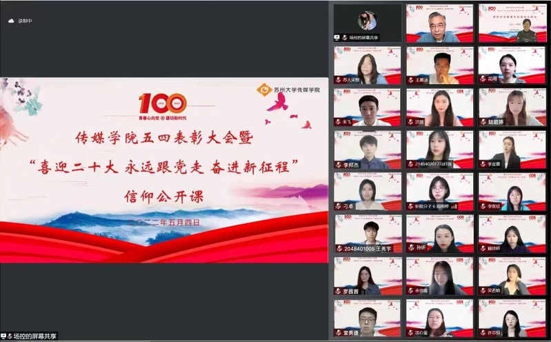 为庆祝中国共青团成立100周年,引领广大青年学生永远跟党走、奋进新征程、建功新时代,5月4日下午,传媒学院五四表彰大会暨“喜迎党的二十大 永远跟党走 奋进新征程”信仰公开课在腾讯会议上成功举行。我院党委书记宁正法,党委副书记、副院长宋海英,学工办主任宋智,团委书记王雁冰,团委副书记花雨,学工办副主任朱飞,以及本科生、研究生团员代表等出席本次大会。