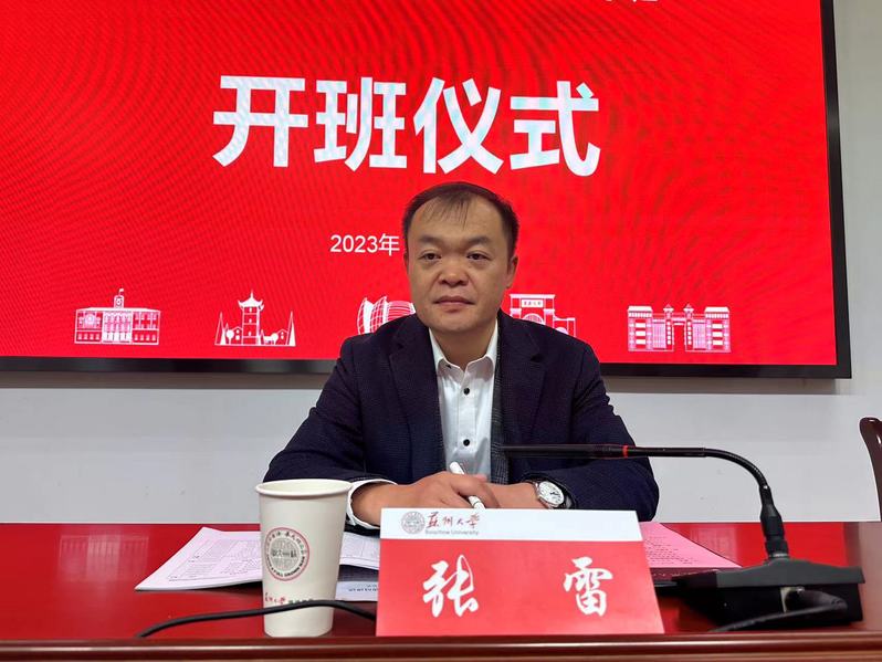 随后,安徽省阜阳市阜南县委常委、宣传部部长张雷同志作开班动员讲话。他指出,意识思想工作是党的一项极端重要的工作,事关党的前途命运,事关国家长治久安,事关民族凝聚力和向心力。本次培训班选择在苏州大学进行,一方面是为了更好加强苏阜两地友好共建合作,另一方面为了让大家来苏州学习先进经验,在今后的工作上、在理论上、在口才上都能获得极大的提升。针对本次培训,他提出了“三转三严”的具体要求。“三转”即:“从领导干部转变为培训学员、从工作状态转变为学习状态、从家庭生活转变为集体生活”;“三严”即:“严肃组织纪律、严肃学习纪律、严肃生活纪律”。最后,他还特别强调了,所有学员在培训期间,必须严格遵守学校规章制度、严禁饮酒、严禁迟到,认真学习,努力把学习成果带回去并转化为推动实践工作的强大动力。