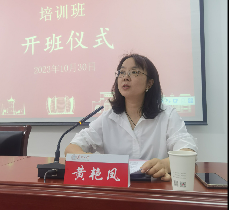 开班仪式上,苏州大学管理培训学院黄艳凤副院长对全体学员的到来表示诚挚欢迎。她向学员们介绍了苏州大学在学科建设、人才培养、科学研究以及服务社会等方面取得的优异成绩。祝愿学员们在苏大学习顺利,生活愉快。