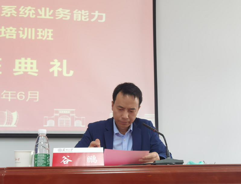 开班仪式上,谷鹏副院长对全体学员的到来表示诚挚欢迎。他向学员们介绍了苏州大学在学科建设、人才培养、科学研究以及服务社会等方面取得的优异成绩。他希望,全体学员通过此次培训,能够提升自身综合素质和工作能力。最后,他祝愿大家在校期间能够学有所成,学有所获。