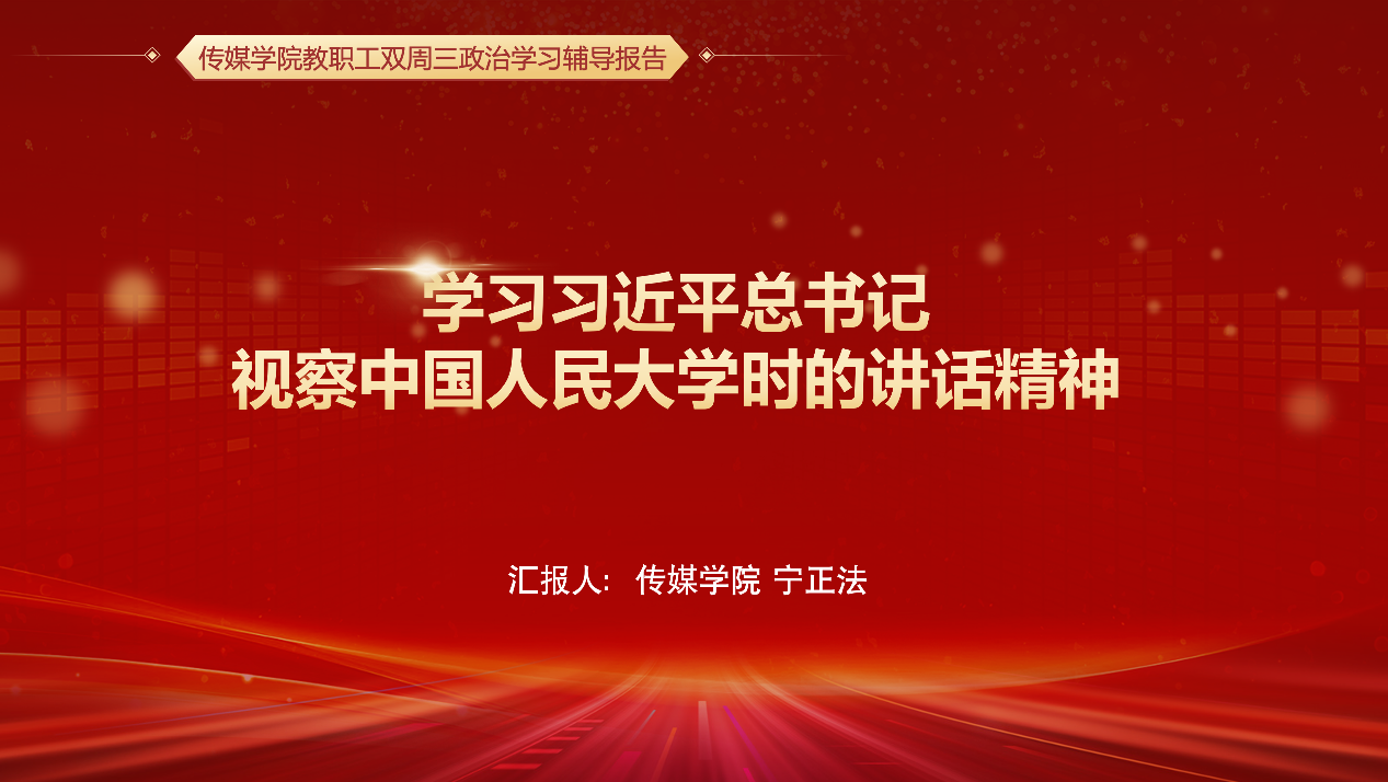 5月25日下午,传媒学院组织教职工通过线上方式开展“双周三”政治学习,本次学习的内容是学院党委书记宁正法所作的“学习习近平总书记视察中国人民大学时的讲话精神”的辅导报告。
