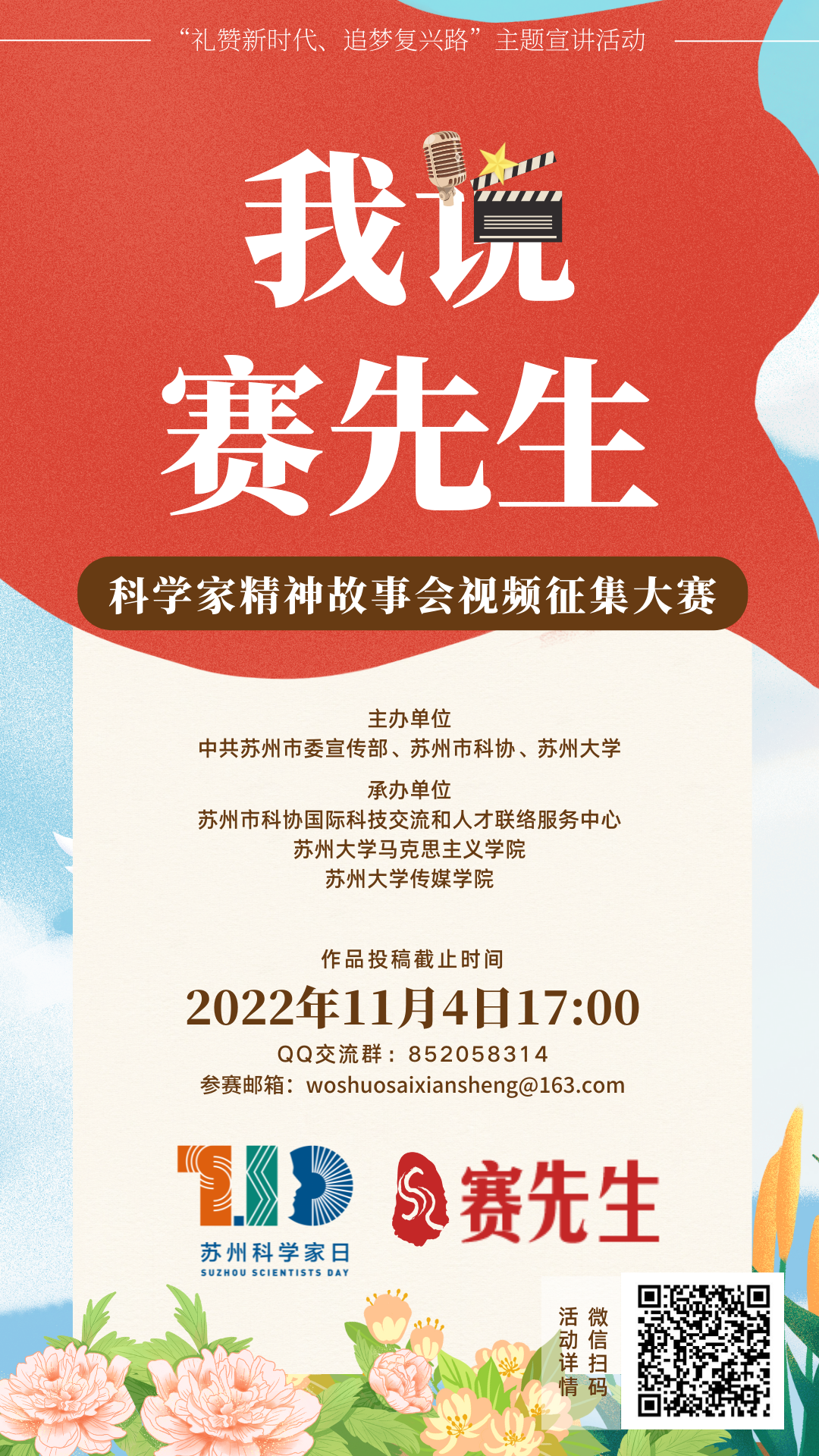 大赛将面向社会大众,鼓励社会各界人士根据自己对中国科学家的理解,将苏州科学家作为主要对象加以创作,通过6分钟的原创短视频展现新时代科学家精神。大赛征集时间将从6月持续至11月,通过“我说赛先生”科学家精神故事会视频征集活动加深公众对科学家精神的体会,进一步弘扬科学家精神。