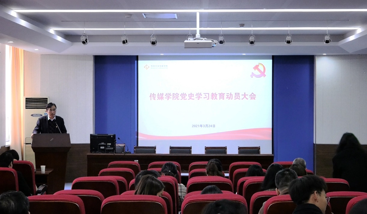 2021年3月24日下午,传媒学院召开党史学习教育动员大会,深入学习贯彻习近平总书记在党史学习教育动员大会上的重要讲话精神,贯彻落实苏州大学党史学习教育动员大会精神,研究部署学院开展党史学习教育相关事宜。学院党委书记宁正法主持会议并讲话。学院师生党员代表参加会议。