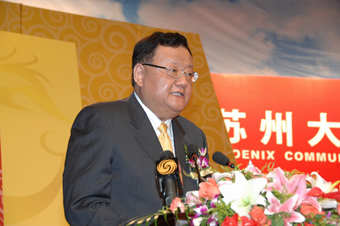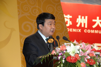 江苏省委常委、苏州市委书记王荣代表苏州市委、市政府致辞,对凤凰传媒学院的成立表示热烈祝贺。王书记在致辞中肯定了苏州大学的发展成就,他说,多年来,苏州大学在创新办学理念,紧贴地方经济社会需求的发展历程中走出了一条富有特色、卓有成效的道路。凤凰传媒学院将以双方的资源优势和品牌影响力为基础,立足市场需求和现代传媒理念,致力于培养具有国际视野和专业技能的新闻传媒人才,同时借鉴国际先进传媒教育经验,把凤凰卫视节目资源导入学院教学科研中,打造独具特色的产学研一体化的节目制作基地和文化传媒产业孵化基地。凤凰传媒学院的成立是优化教育资源、提升办学效益的有效探索,也是加快推进苏州教育现代化的有利行动,对加快发展苏州文化产业、推动苏州大学建设都具有重要意义。