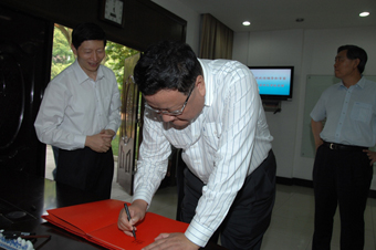 结束了独墅湖校区的行程之后,刘长乐主席一行来到校本部。在红楼会议中心,王卓君书记和朱秀林校长向凤凰卫视的各位来宾介绍了我校的历史发展沿革以及目前我校的发展情况。随后,刘长乐主席还饶有兴致地参观了本部校园,并在校史馆留言册上提笔留念。