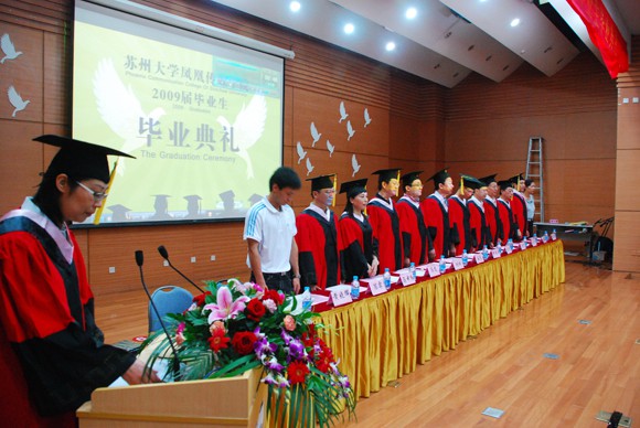 最令人激动的是,在持续的《东吴校歌》背景音乐中,身着硕士服和学士服的同学们分批、有序地从导师手中接过学位证书,并由导师拨穗,接受师长的祝福与训导。此外,学院还对2009届校级优秀硕士毕业研究生、优秀本科毕业生进行了表彰,并颁发了证书;2009届毕业生向学院赠送了礼物,感谢学院对他们的培养。