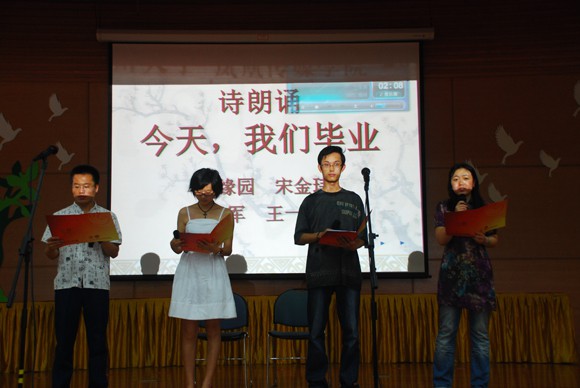 毕业典礼结束后,文学院、凤凰传媒学院09届毕业生举行了以“我们和未来有约”为主题的告别演出。没有过多修饰的布景,没有华美绚烂的灯光,没有轰动喧嚣的舞台,整场演出却由于融入了全体毕业生的真挚心意而显得别具匠心、魅力非凡。无论是热烈欢快的开场舞蹈《We are all in this together》,还是优雅古朴的古琴独奏《梅花三弄》,或是诙谐逗趣的音乐短剧《大学五幕》,或是饱含深情的诗朗诵《今天,我们毕业》,都浓缩了两院学生的才艺精华,表达了毕业生特有的离别心境和美好祝愿。