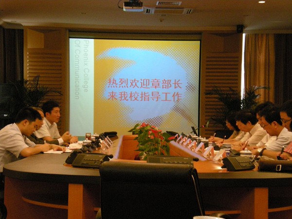 章部长在听取了报告和交流之后,首先充分肯定了我校在教学面向社会、面向世界的现代大学办学理念的积极探索,特别是凤凰传媒学院通过校企强强联合实现的从理念到管理上的这种全新模式。他对学院的发展寄予了深切希望,希望学院能够继续发挥双方的合作优势,在制度建设、教育改革方面迈出更大的步子,同时积极促进双方共赢,在培养面向社会、面向世界的优秀传媒人才的共同目标前成功实现“蛙跳”。