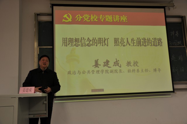 本次培训邀请了政治与公共管理学院副院长,社会科学系主任,博士生导师姜建成教授作题为“用理想信念的明灯,照亮人生前进的道路”的讲座。在赵阳书记简要介绍姜建成教授之后,姜教授围绕“理想与信念”两个关键词开始了他的讲座。