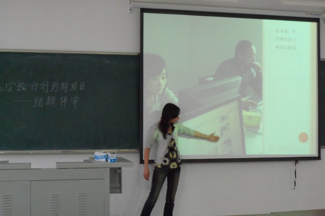 07级的华乐同学也自信满满地走上讲台。她们团队的课题是《网络在大学生创就业过程中的调查和分析》。她主要针对大学生开网店的现象进行了分析,并且还展示了在采访中的一些照片。老师们对她的课题研究予以充分的肯定,一致认为她的课题研究思维周密,并且最后研究提出的建议也很有实践性。